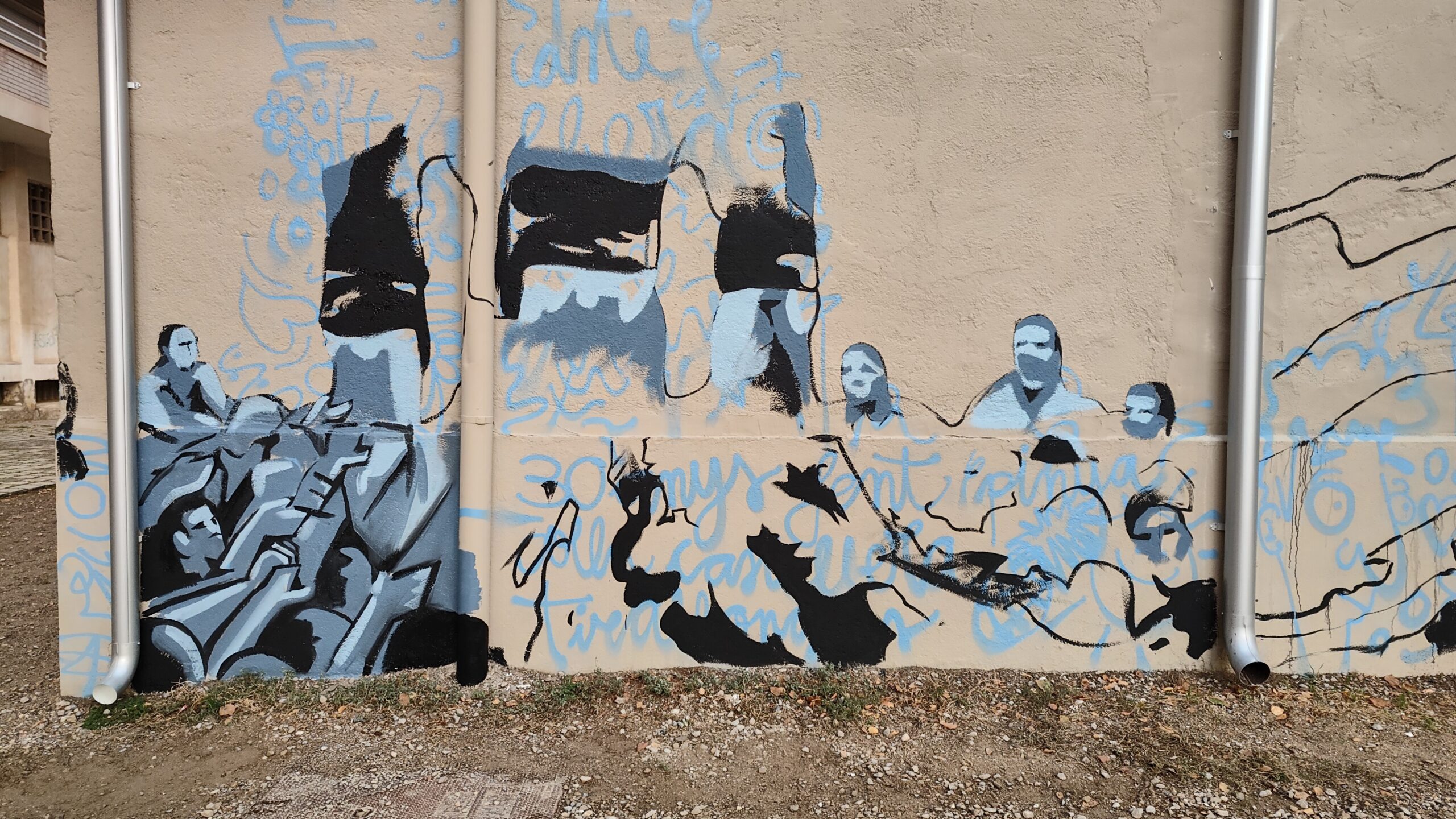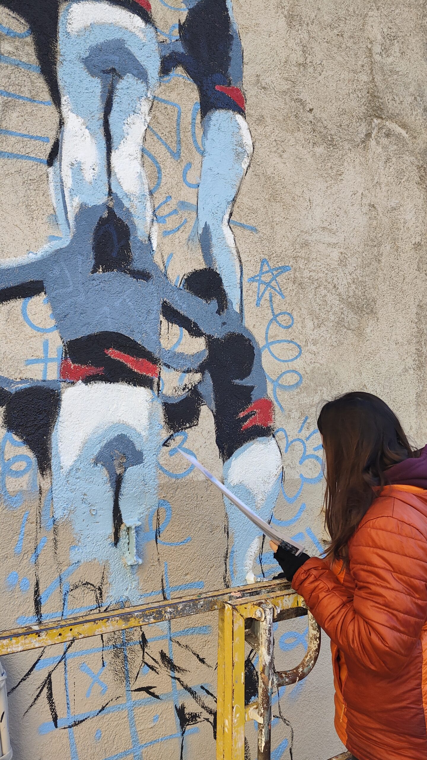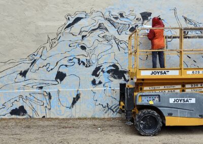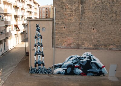 Aquest projecte el vàrem realitzar al mateix local d’assaig de la colla, utilitzant el color blau característic de la seva camisa i amb imatges pròpies que ens varen ensenyar per utilitzar de referència, plasmant al mur els trets més característics del món casteller, la pinya, els músics i un castell a tamany real.